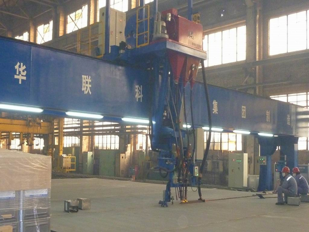 该机接纳三弧三丝四电源的埋弧焊方法,焊接方法为单面双面成型, 该机主要由主门架、焊接小车、焊枪上下升降装置、焊枪左右横移装置、埋弧焊跟踪装置、上部焊剂循环装置、焊接参数存贮器(控制器)、电磁平台装置、铜衬垫装置、焊剂铺撒扫除小车、底部焊剂接纳装置、埋弧焊接系统等组成。该机属于海内首创,现已被大连船舶重工、扬子鑫福造船、舜天造船、振华港机等海内各大船厂使用。