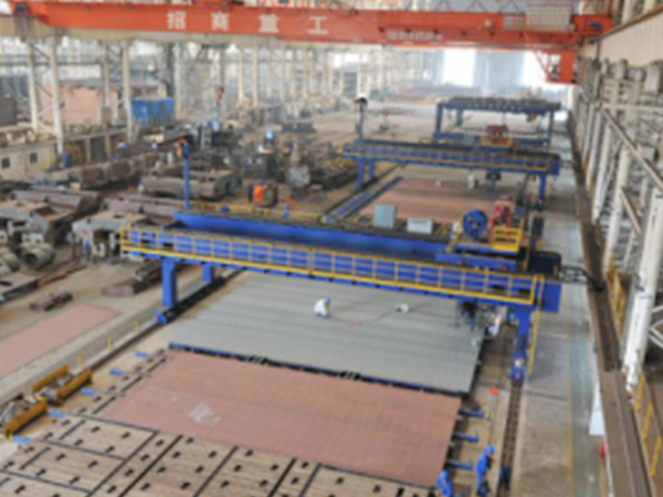 每线配有二个肋板纵桁点焊门架。在分段就位后,需要装置的肋板及桁材由行车运入装置点焊位置,每个门架配备的6台CO2焊接装备将肋板与纵骨钢板点焊到一起,完成基本装置点焊事情。完成肋板、纵桁点焊的分段由分段搬运台车运到下一个肋板、纵桁焊接工位。
